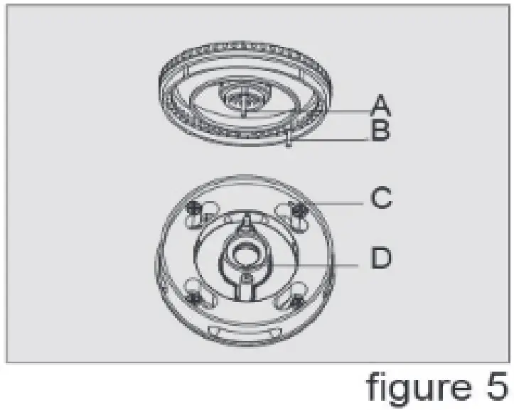 To fix the burner, please do as below: Point the locating pin Ato the locating hole D and point the locating pin B to the locating hole C. If there’s a small burner, put the part E to the part F. Please make sure the fire caps are placed right and they can’t be turned to the left or right side.