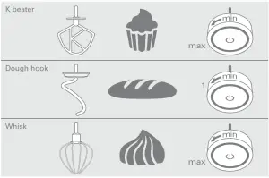 K-beater![]() | Creaming butter/margarine and sugar | 2.72kg (9 Egg mix) | 4.55kg (15 Egg mix) | Min → Max | 4 |