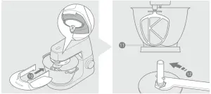 - Lower the mixer head. If the clearance needs to be adjusted, raise the mixer head and remove the tool. Ideally the whisk and K-beater should be almost touching the bottom of the bowl ⓫.