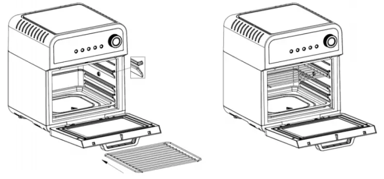 When needed, place the wire rack on the top level of the appliance, as shown in the illustrations above. Always wear protective, insulated oven mitts when removing the wire rack from the hot air fryer.