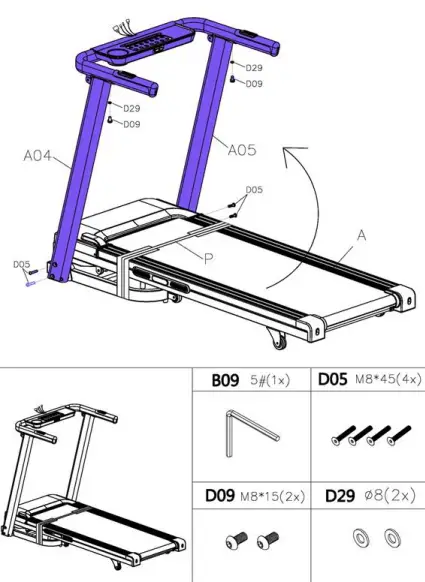 STEP 2 Attach the posts (A04 and A05) to the treadmill (A) with 2x bolts (D05) on each side. Attach the handrails (A03) to the posts (A04 and A05) with 2x washers (D29) and 2x bolts (D09).