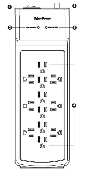 Controls power to all outlets. The switch is also a 15 A breaker. When an overload occurs, it will automatically switch off. To resume operation, ensure the overload condition is removed and reset the surge protector by switching the unit ON.