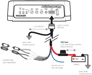 Ground Noise? KICKER amplifiers are engineered to be fully compatible with all manufacturers’ head units. Some head units may require additional grounding to prevent noise from entering the audio signal. If you are experiencing this problem with your head unit, in most cases running a ground wire from the RCA outputs on the head unit to the chassis will remedy this issue. If you still have problems, run your input signal at speaker-level from your source unit to the amplifier.