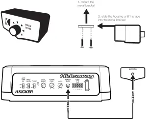 Remote Bass Control: With the included remote bass control, you have the ability to control the output level of your powered enclosure remotely. When plugged into the enclosure, the remote bass control bypasses and takes the place of the gain control on the side panel. To mount the remote bass level control, simply screw the metal bracket to the chosen location, then slide the housing onto the bracket until it snaps into place. Run the cable from the controller to the “Remote Bass” jack on your powered enclosure’s side panel. DO NOT disconnect the remote bass control when the amplifier is on!