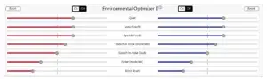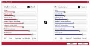 Environmental Optimizer II allows specific gain and Noise Tracker II adjustments for seven different environments, ensuring the user receives optimal gain and noise reduction settings as the acoustic environment changes. Classification is performed on a continuum if the listening situation has characteristics of more than one listening environment. With binaurally fit wireless devices the hearing aids will optimise and synchronise the Environmental Optimizer settings for a binaural fitting. If a user experiences difficulty in a particular listening environment adjust the sliders to assign environment specific gains and noise reduction without requiring a manual program change. *Feature
