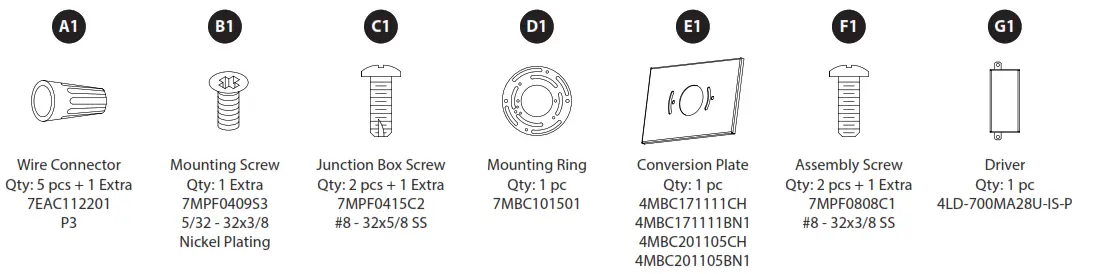 – All parts must be used as indicated in these instructions. Do not substitute any parts, leave parts out, or use any parts that are worn out or broken. Failure to follow this instruction could invalidate the ETL/CETL listing of this fixture.