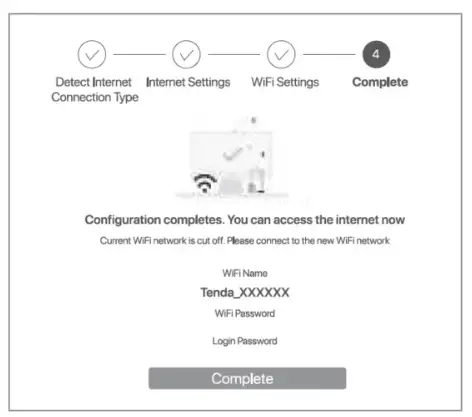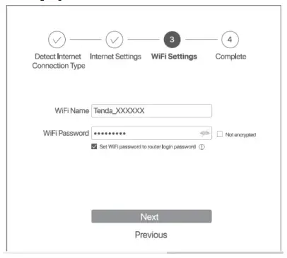 - Set the WiFi name, WiFi password and login password for the router. Click Next.