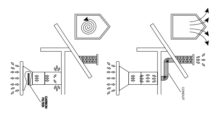 - Connect the cooker hood operating in extraction mode to a suitable ventilation duct (do NOT connect the cooker to smoke or flue gas ducts, which are in use). It requires installation of the air extraction duct to the outside. The length of the duct (usually a pipe of Ø 120 or 150 mm) should not be longer than 4-5 m. An air extraction duct is also required for telescopic and furniture hoods in absorption mode. · Cooker hood operating in air recirculation mode requires the installation of an activated charcoal filter. In this case, installing an extractor duct is not required, however it is recommended to install an air guide vane (Mainly in chimney cooker hoods).