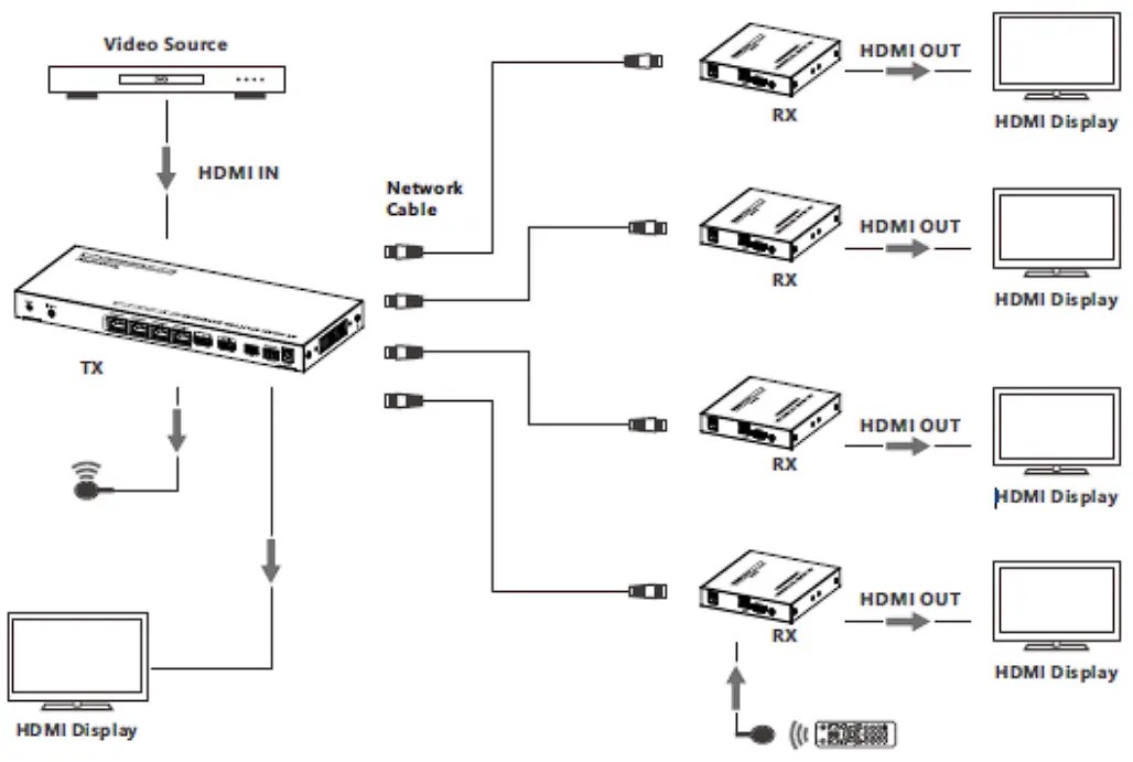 - Connect the CAT6 OUT ports of the transmitter to the CAT6 IN port of the receivers through the network cables.