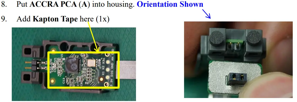 - Snap ACCI to Board Support (A). Note that part of the ACCI Flex Circuit goes between the PCA and the Board Support as shown. ESD precautions required.