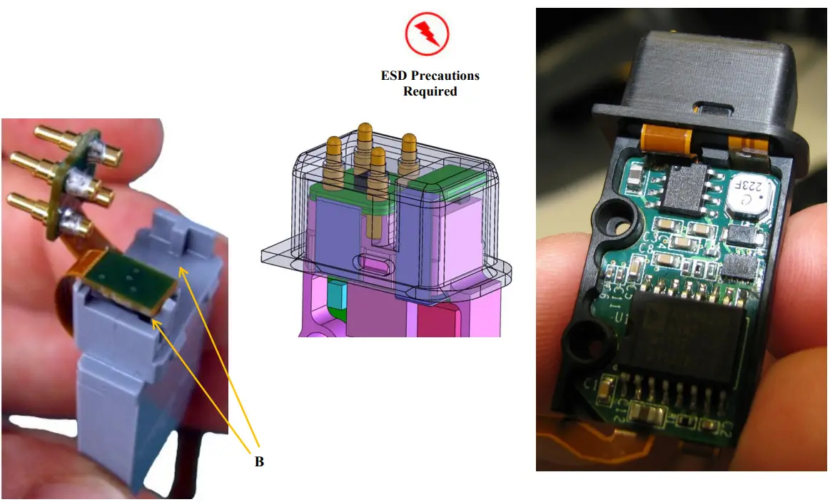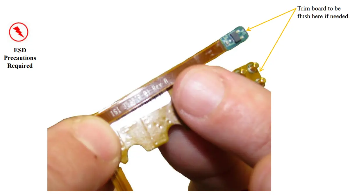 - Cut and place a small piece of Tape (B) onto Board Support to hold both boards down. Fold sub-boards into position and attach Dallas Pod Cover (A) to Board Support as shown. Do not crease Flex Circuit. ESD precautions required.”