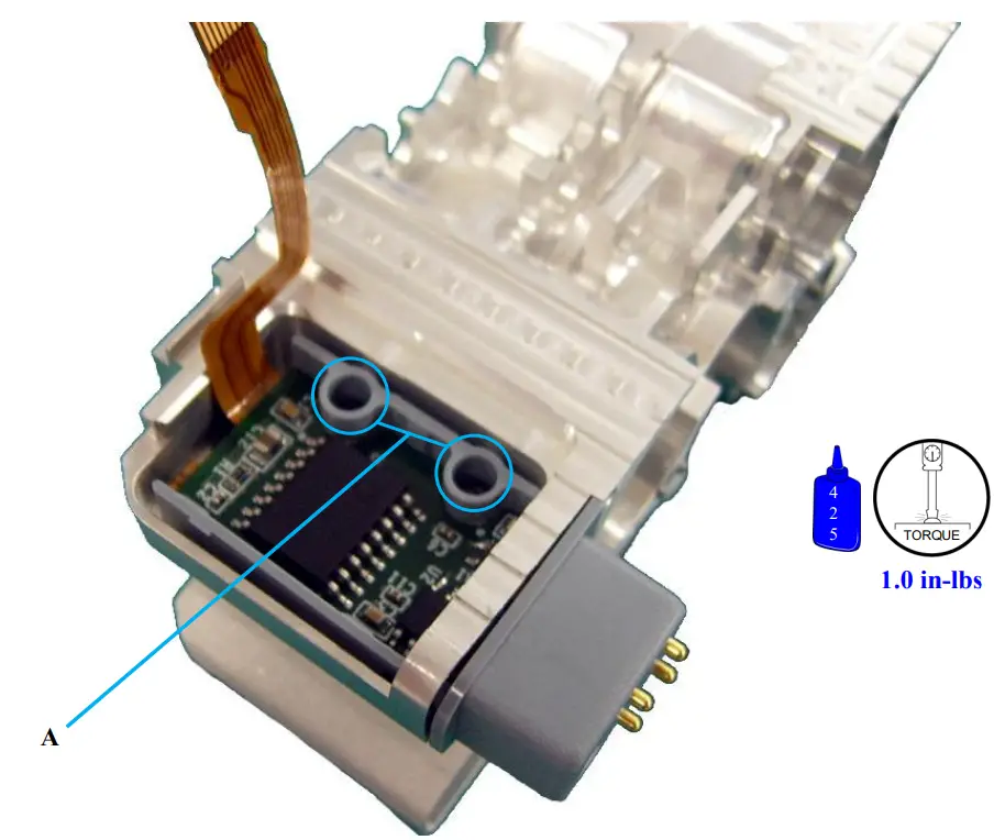 - Insert into Carriage Housing and attach with Qty: 2 Screws (C) and Loctite 425. Torque to 1.0 in-lbs using (D).