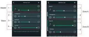 Users can group multiroom and multizone on the Application, for example you can group device 1,2,3 and 4 together and play same music in sync, or group device 1 and 2 as zone A and device 3 and 4 as zone B, and play different music in zone A and zone B.