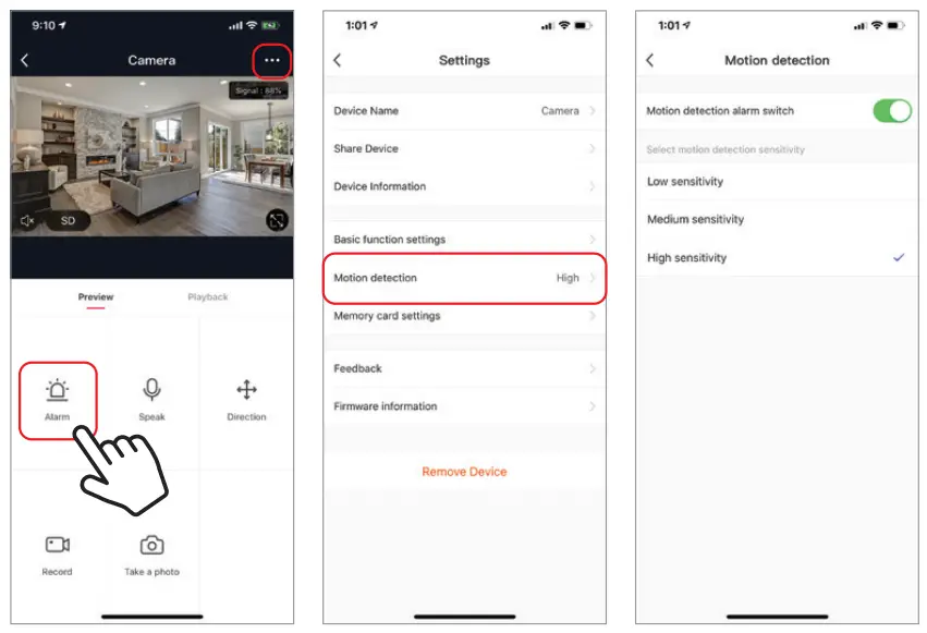 and set the sensitivity setting. You can also get to this by hitting the “alarm” button on the main camera page.