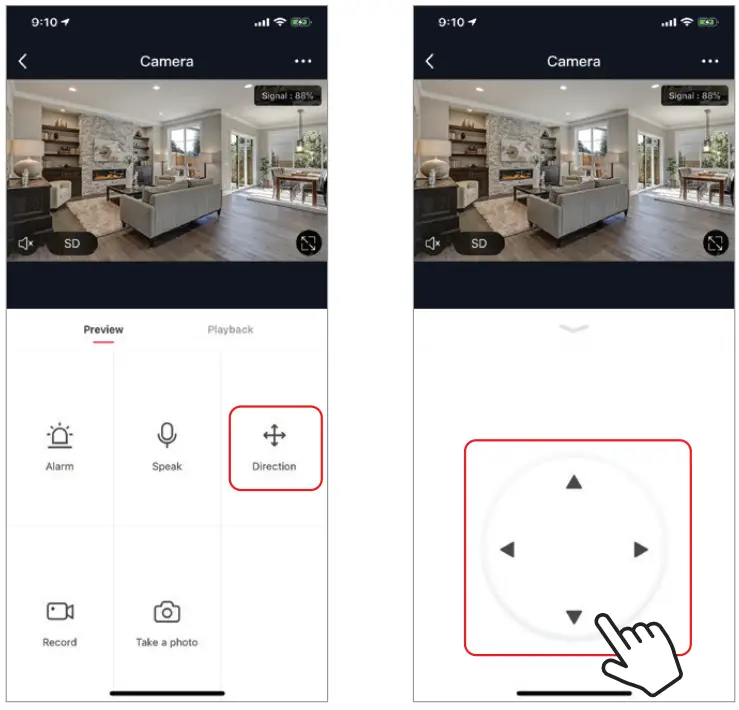 To remotely control the camera press the “Direction” button on the main camera screen. From here you can rotate the pan or tilt the camera lens. You can also control the pan and tilt movement of the lens by turning your phone sideways and dragging your finger in any direction on the screen.