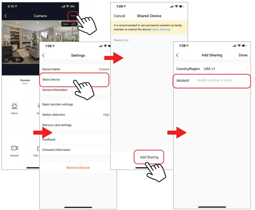 On the next page press “Add Sharing” at the bottom. After that, enter the email on the person’s Smart Life account that you would like to share the camera. They will get a