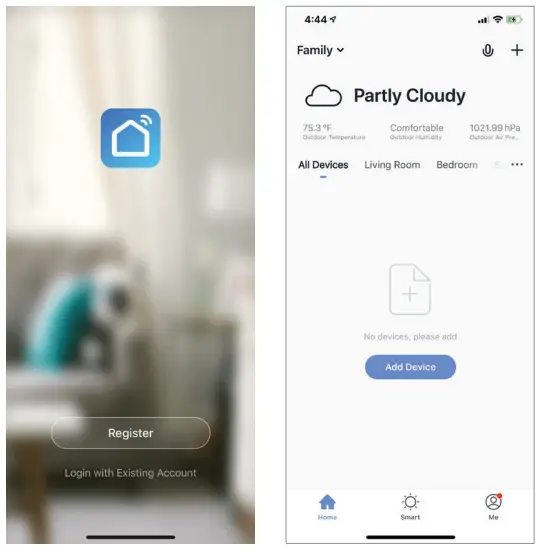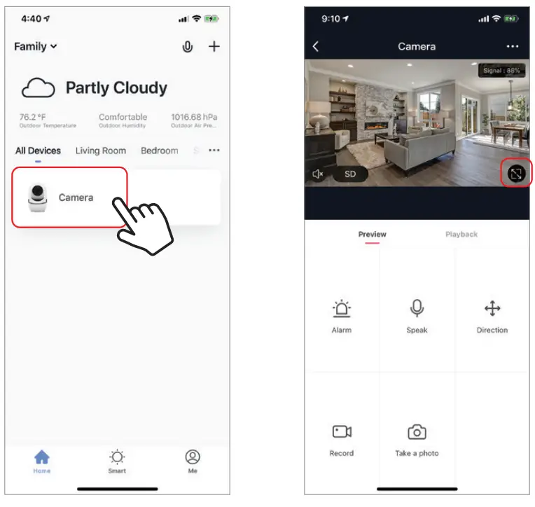 - Press the (+) symbol in the top right corner of the app and select the Smart Camera fromthe list of devices to add.