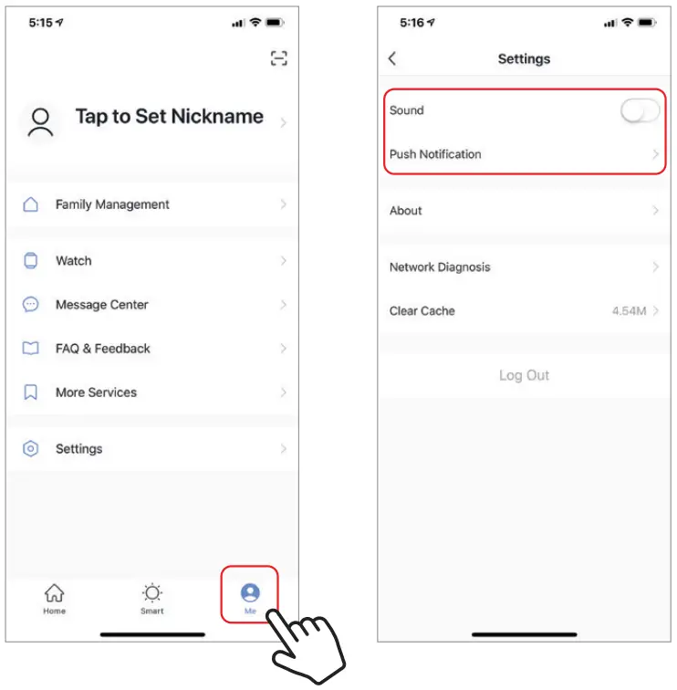 - You can turn on/off notifications for all devices connected to the app by clicking on the “Me” button at the bottom right of the screen.