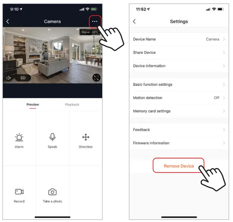 To share access to your camera with someone else’s Smart Life account, press the camera options button at the top right of the main camera screen. Then hit “Share Device”.