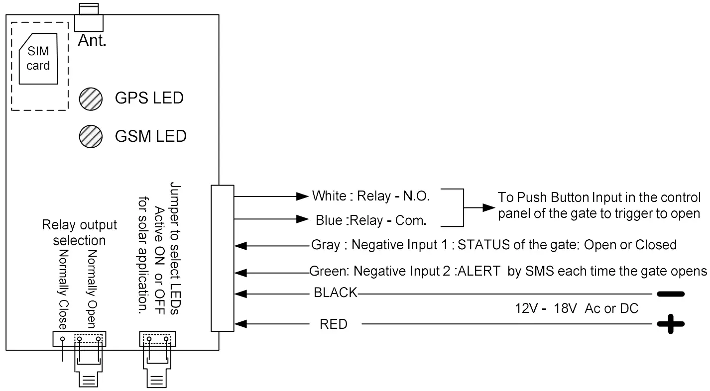 Make sure to insert the SIM card and connect the Antenna before you power-up the unit. Do not attach the unit’s antenna to any metal surface. The unit can operate with voltage between 12V to 18V AC or DC using the black and red wires. If DC power is used, the BLACK wire is the negative and the RED wire is the positive.