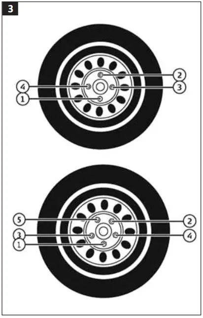 Tighten the wheel nuts/bolts in the right order. The image shows the correct tightening sequence for rims with 4 or 5 holes.