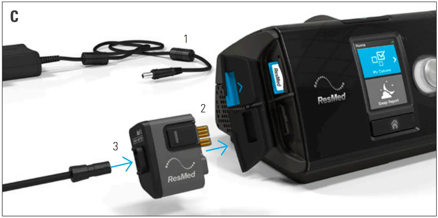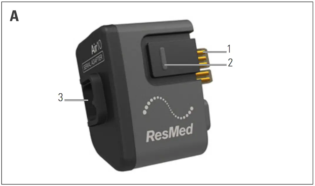 The Air10 serial adapter shown in illustration A is compatible with AirSense™ 10 /AirCurve™ 10 / Lumis™ VPAP 100 / Lumis™ VPAP 150 devices.