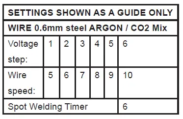 - Setting the welder controls. In principle, the lower the amperage required, the slower the wire speed. See setting chart below for voltage and corresponding wire speeds. Note: these settings are only a guide and will vary according to the operator’s experience.