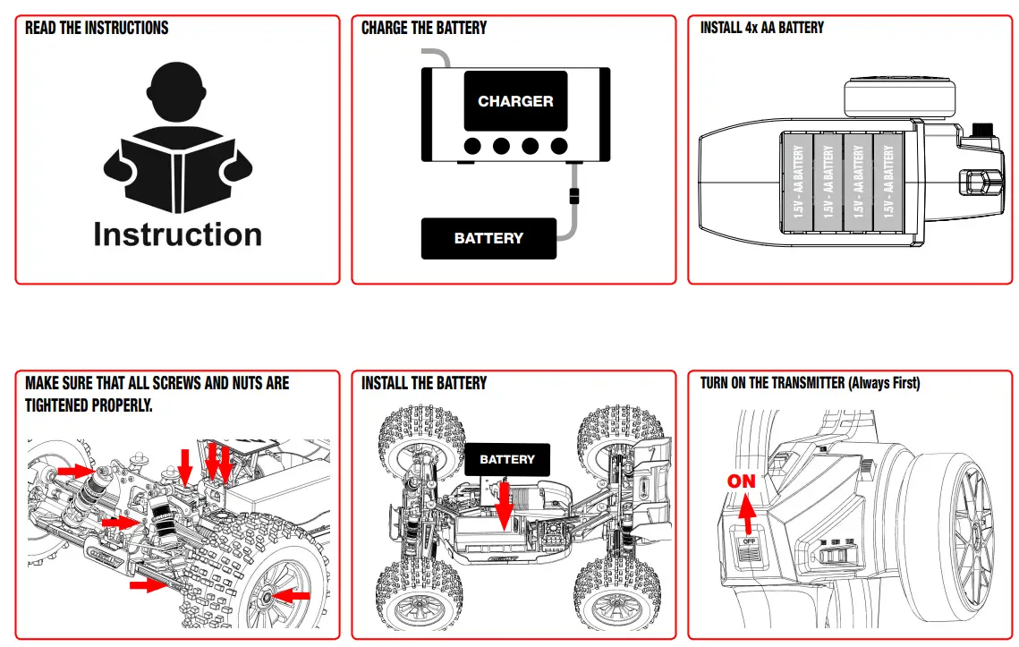 - Before driving your vehicle, please read this manual in its entirety and examine your vehicle and radio control system for any defects.