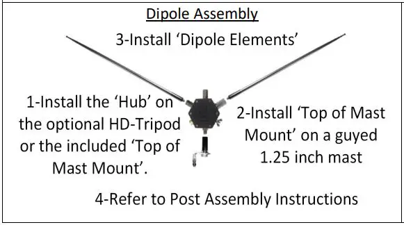 * As a Yagi, Alpha Antenna does not support 30 or 40 meters on the HexTenna™. When deployed as a Dipole, tuning on 30/40 meters is achieved on the Dipole after the wire elements are installed, by equally retracting each element till resonance is achieved. The wire add-on elements are attached to the tip of each telescopic