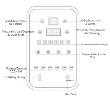Sequential Compression Mode: routing ①-①②-①②③-①②③④-①②③④⑤ →①②③④⑤⑥,chamber ①inflates,then hold the pressure,②starts inflating,
