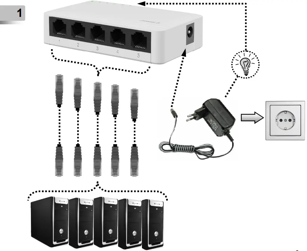 - Provides 5 10/100/1000 Mbps Ethernet ports (RJ45 connectors)