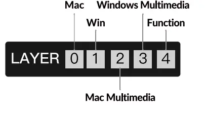 There are five layers of key settings on the keyboard. The layer 0 is for the Mac system. The layer 1 is for the Windows system. The layer 2 is for the Mac Multimedia keys. The layer 3 is for the Windows Multimedia keys. The layer 4 is for the Function keys.