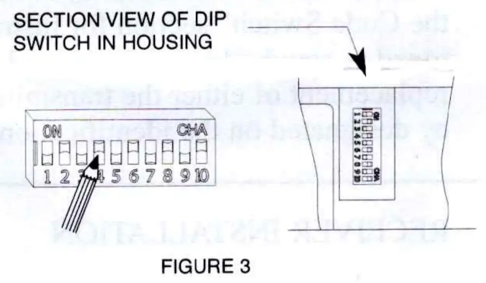 Set both code switches to the code of your choice, being sure both are set the same since a different setting of just one switch will prevent operation. The digital code is determined by the position of the 10 small switches numbered 1 through 10 located in the receiver and the transmitter. Any combination of “on” or “off” positions can be selected by using a pencil or a pen. (Note: The switches are in the “on” position when the switch is set ti the “on” side of the code switch.