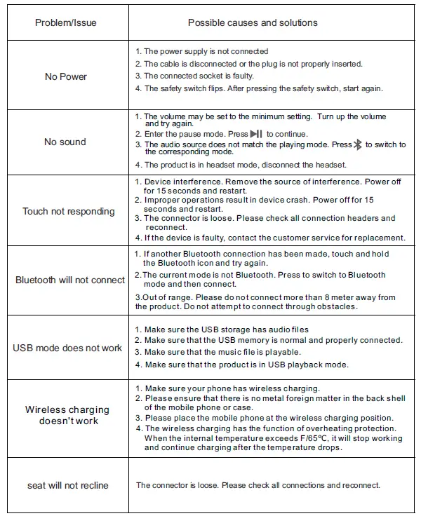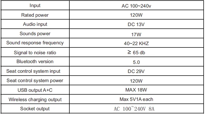 - Bluetooth goes into standby mode when the sound and seat control systems are turned on. Open your Bluetooth device and search for the Bluetooth name“iTable406” and click connection is successful,the stereo plays a “beep”.If you want to disconnect the current Bluetooth connection, press and hold for about 3S, and the Bluetooth will be restored to the state to be connected. Insert the USB storage ( the USB port next to the headphone hole) with music files, and the product will automatically enter the USB playback mode. Disconnect the USB connection and the device automatically switches to Bluetooth mode. (supported file formats.