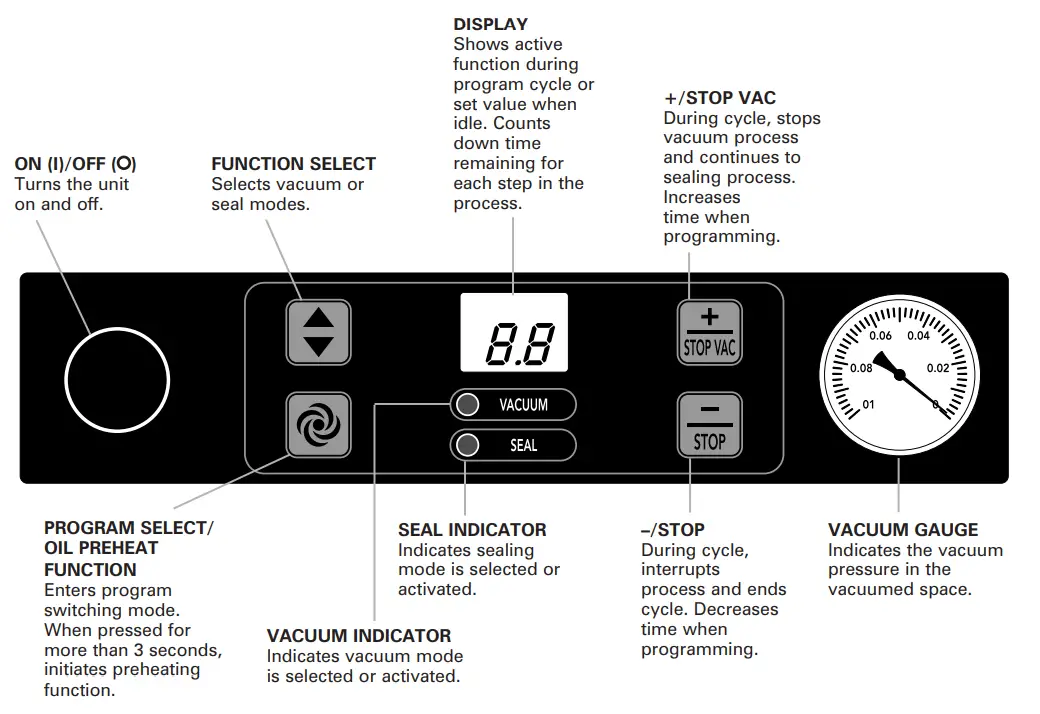 will illuminate. - The unit will display vacuum time. Press the +/STOP VAC