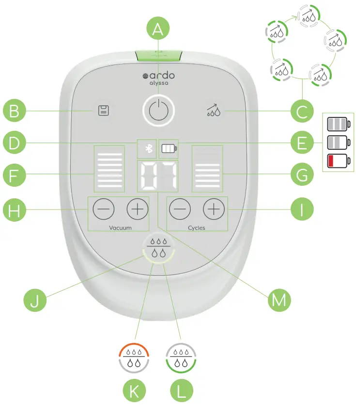 | 2-phase breastpump | Ardo Alyssa expresses in two phases: the stimulation and the expression modes, which imitate the sucking behaviour of the baby. This means a rapid cycle (suction frequency) with low vacuum (suction level) to stimulate the let-down reflex and a high vacuum with a slow cycle for efficient suction. |