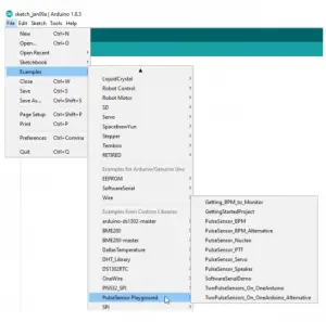 Once the sample file is included, select File Examples, and scroll down to Pulsesensor Playground. Some samples will appear. Select one of them (we tried Getting BPM to Monitor).