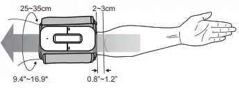2. Stretch your left (right) arm in front of you with your palm facing up. Slide and place the cuff onto your arm with the artery mark region (in red) toward the lower arm. Wrap and tighten the cuff above your elbow. The red line on the edge of the cuff should be approximately 2 to 3 cm (0.8 to 1.2 inches) above your elbow.
