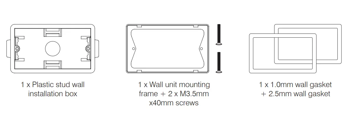E120 is supplied with all the cables and wall box to fully install the system. Please refer to the `E120 installation manual’ which provides all details on the positioning and cable requirements of the system.