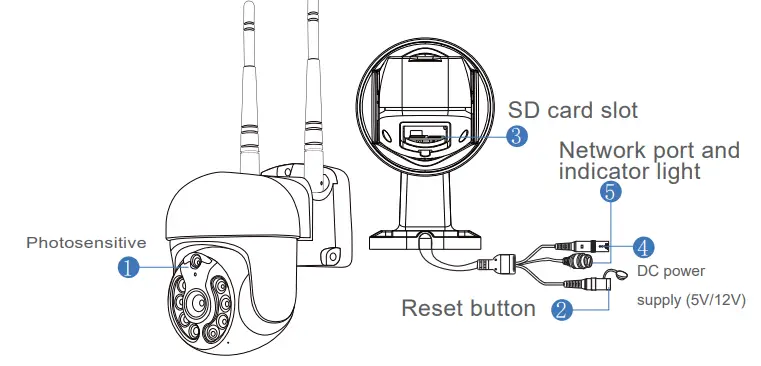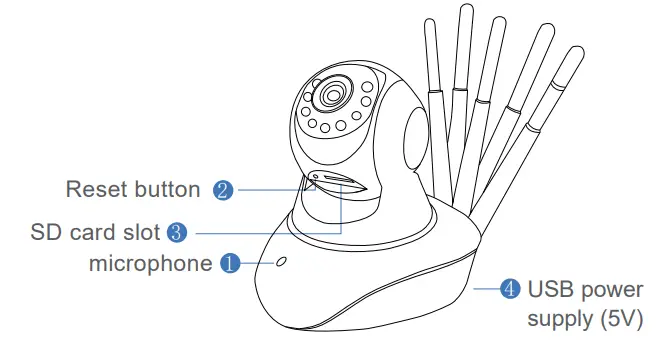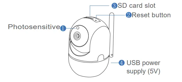 | 2. Reset button | The working state of the device, long press 3-5 seconds to restore the factory, the camera will have a voice prompt broadcast. |