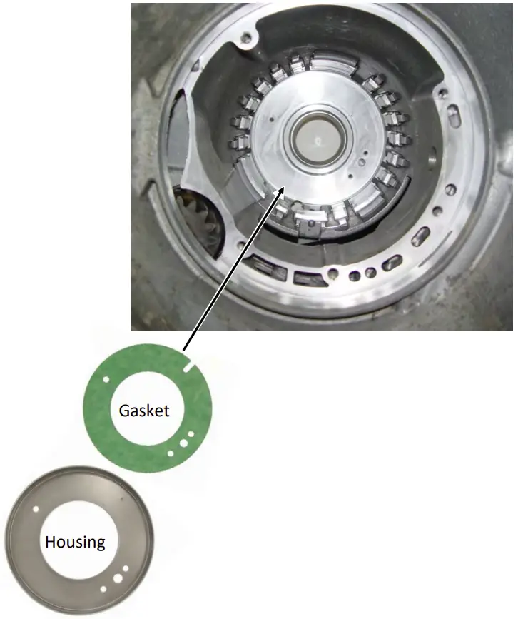 Discard OE Housing Gasket. Install new Non Shrinking Gasket under Piston Housing. Gasket works with all piston housings.