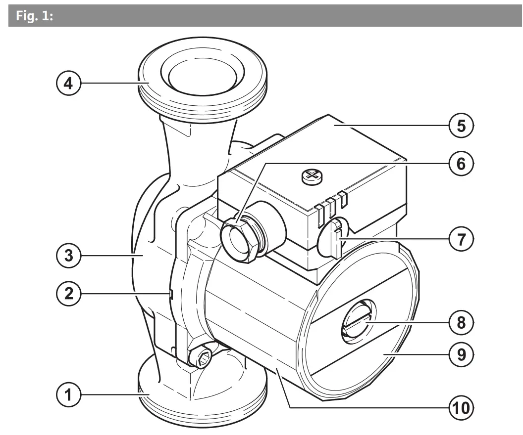 - Direction arrows on the pump housing and the insulation shell (accessories) indicate the direction of flow (fig. 3, item 1).
