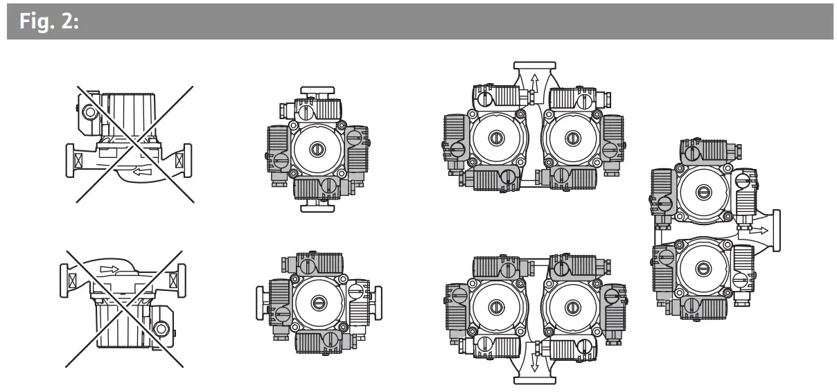- Install the pump with the pump motor horizontal and free from mechanical tension. See fig. 2 for installation positions of the pump.