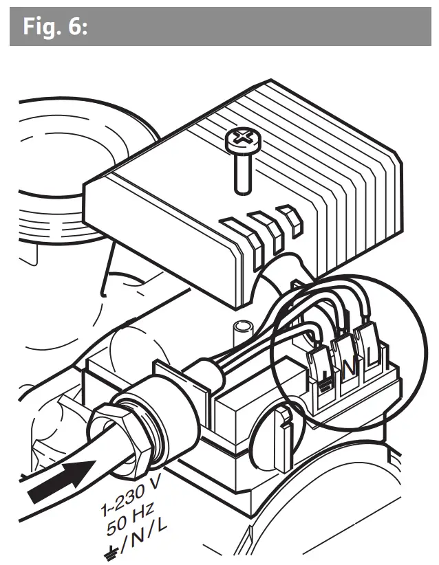 - The connection cable can be taken through the cable feed-in right or left. Exchange dummy plugs and cable feed-in as necessary. When the terminal box is positioned laterally, always arrange the cable feed-in from below (fig. 5).