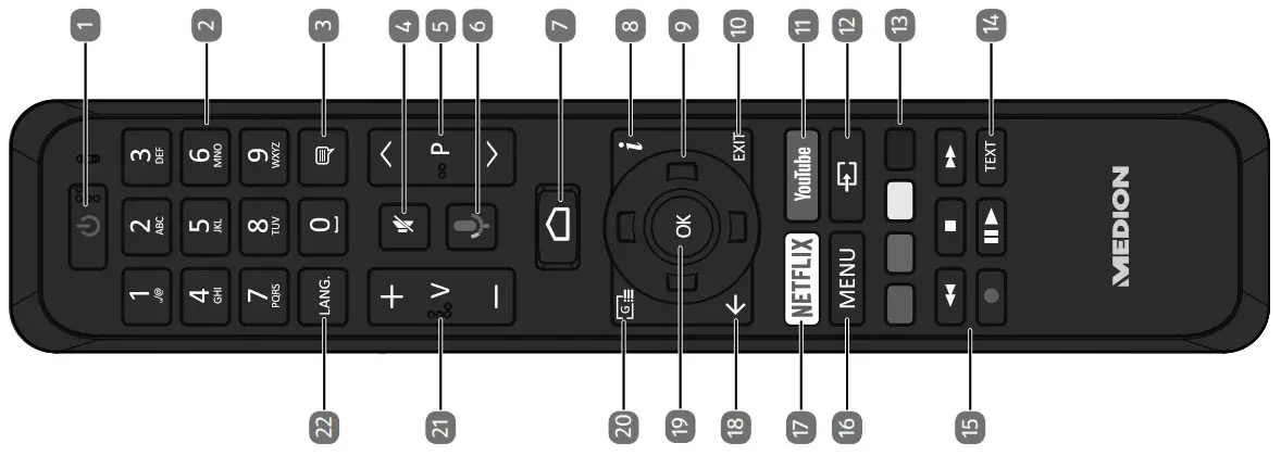 : Switch smart TV on/off (switch standby mode on/off).- Number buttons: