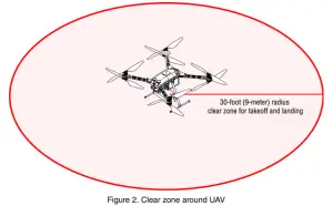 - Make sure the RangePro X8 is in a good takeoff location (free of debris and a safe distance from objects and structures like buildings and trees. TerraView recommends a 30-foot or 9-meter radius around the aircraft) for takeoff and landing (see figure 2). Remember that this area will probably be the return-to-home/ return-to-launch (RTH/RTL) and landing location.