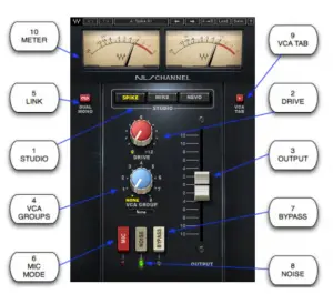 NLS graphic user interface comprises three elements, the Channel controls, the Buss controls, and the VCA Group Console section available as a Tab in the Channel