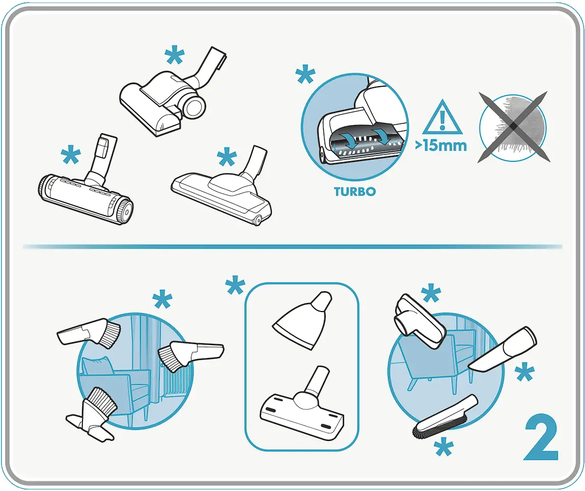 Certain models only! - Turbo nozzles have a rotating brush where parts can get entrapped. Please use them with caution and only on intended surfaces. Please turn the vacuum cleaner off before removing entrapped parts or cleaning the brush.