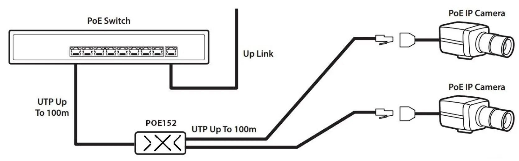 The POE152 is easy to install into an IP CCTV system as shown below. It can be installed at the end of a 100 meters network cable to extend the network and PoE supply by 100 meters at full speed.