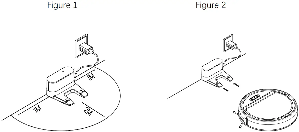 - Automatic ChargingPlease place the charging base against the wall, remove all obstacles 1 meter on the left and right and 2 meters in front of it, and then connect the power supply. When the power is insufficient, robot cleaner will automatically source the recharge seat to charge; In the selection mode (power on status), press the recharge button on the host panel, and it will automatically source the recharge base for chargingas shown in Figure 1 and 2.